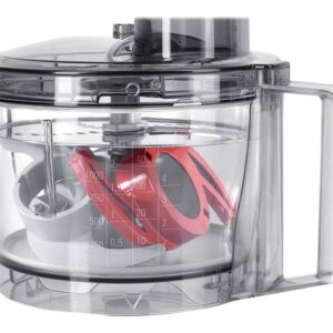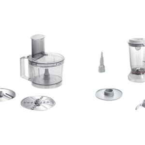 | Tarvikud kaasa arvatud | 1 x Lid, 1 x Plastic mixing bowl 500g, 1 x Plastic blender attachment, 1 x Reversible shredding disc coarse/fine, 1 x Beating disc, 1 x Reversible slicing disc thick/thin, 1 x Pusher, 1 x Universal knife, 1 x Accessory carrier, 1 x Blade protection cap |