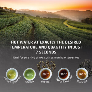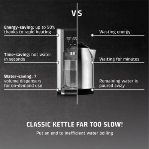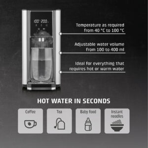 | Muud funktsioonid | 7 pre-set quantities as required: 100/150/200/250/300/350/400 ml and continuous; Perfect for the preparation of tea, instant coffee, instant noodles and baby food; Energy-saving: 50% less than conventional electric kettles; 13 different temperature settings: 40-100 °C (in 5 °C intervals) and without heating; Direct selection button for preparation of baby food (37 °C) |