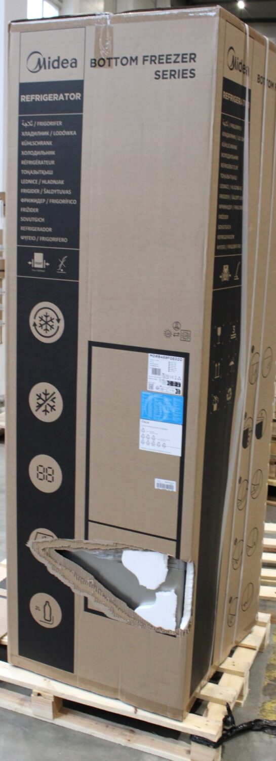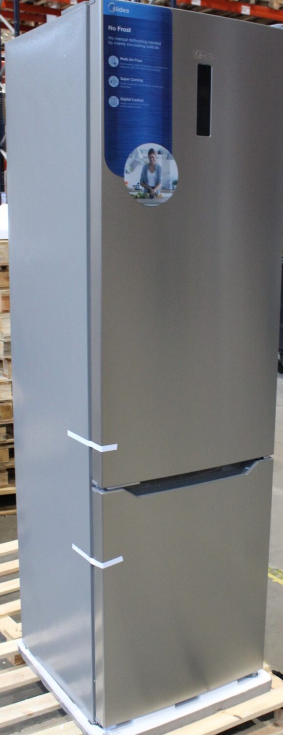 Midea Refrigerator | MDRB489FGE02O | Energy efficiency class E | Free standing | Combi | Height 201 cm | No Frost system | Fridge net capacity 247 L | Freezer net capacity 83 L | Display | 41 dB | Stainless steel | DAMAGED PACKAGING