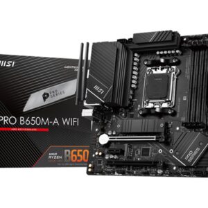 MSI | PRO B650M-A WIFI | Processor family AMD | Processor socket AM5 | DDR5 DIMM | Memory slots 4 | Supported hard disk drive interfaces SATA, M.2 | Number of SATA connectors 4 | Chipset AMD B650 | mATX