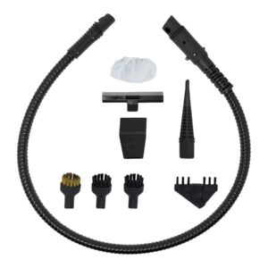 | Tarvikud kaasa arvatud | 3 x Floor cloths; Sockette; Flexible steam hose; Steam lance; Window cleaner frame; Round brush with brass bristles; 2 x Round brushes with nylon bristles; Grout accessory; Upholstery accessory |